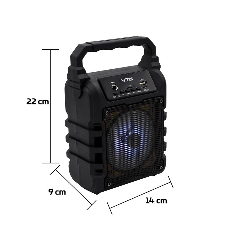 Parlante inalámbrico recargable de tamaño compacto con potencia de 6W RMS. Incorpora luces led de múltiples colores en el parlante, entrada para micrófono de 6,3 mm, radio y manija para que lo puedas llevar a donde quiera que vayas.