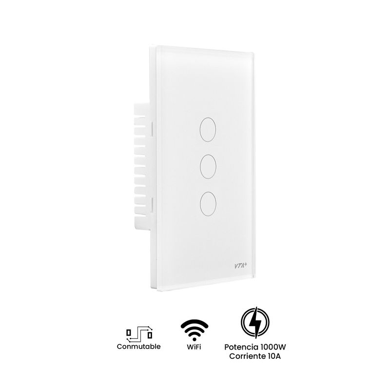 Moderniza tu hogar con el Interruptor Smart Triple VTA+, diseñado para ofrecer control táctil y remoto desde la aplicación móvil. Con tres fases independientes, este interruptor te permite gestionar diferentes circuitos de manera individual, brindando mayor comodidad y eficiencia.
