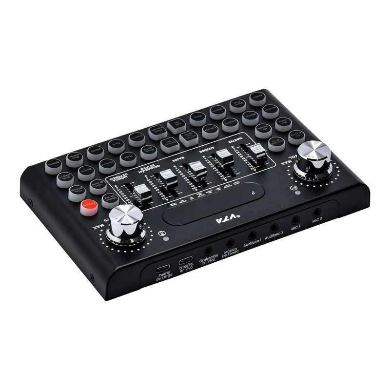 Lleva tus transmisiones en vivo, karaokes y producciones de audio al siguiente nivel con el Mezclador Recargable Multimedia VTA. Diseñado para ofrecer un control total sobre tu contenido, cuenta con 7 canales de entrada, incluyendo USB-C para PC, múltiples entradas 3.5mm para dispositivos móviles, micrófonos y audífonos. Gracias a su conectividad Bluetooth, puedes enlazar tus dispositivos de forma inalámbrica y manejar la reproducción de música desde el mezclador. Disfruta de 18 efectos de sonido integrados, funciones de cambio de voz, delay y eliminación de ruido. Su diseño compacto y liviano facilita el transporte, ideal para creadores de contenido, podcasters y músicos.