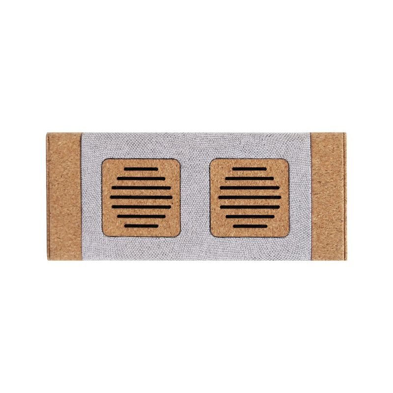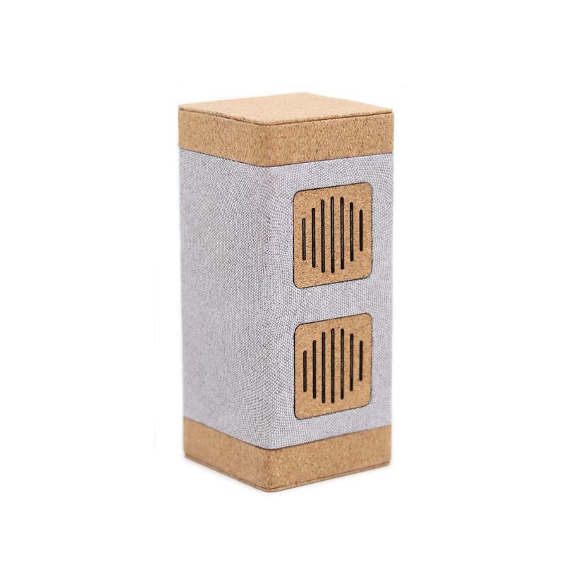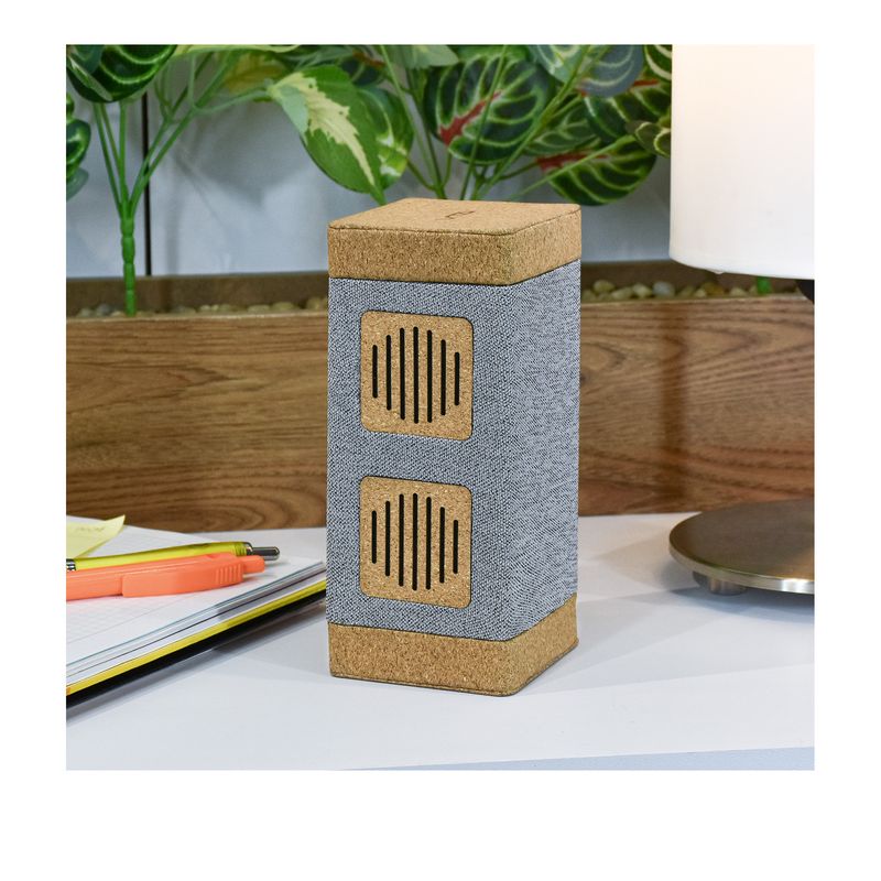 Parlante recargable inalámbrico con conectividad Bluetooth y potencia de 12W RMS, fabricado en material R-PET ecologico y corcho. Además por la elegancia de su diseño y la forma del mismo lo puedes colocar en cualquier lugar o llevarlo contigo con tipo de carga Tipo-C