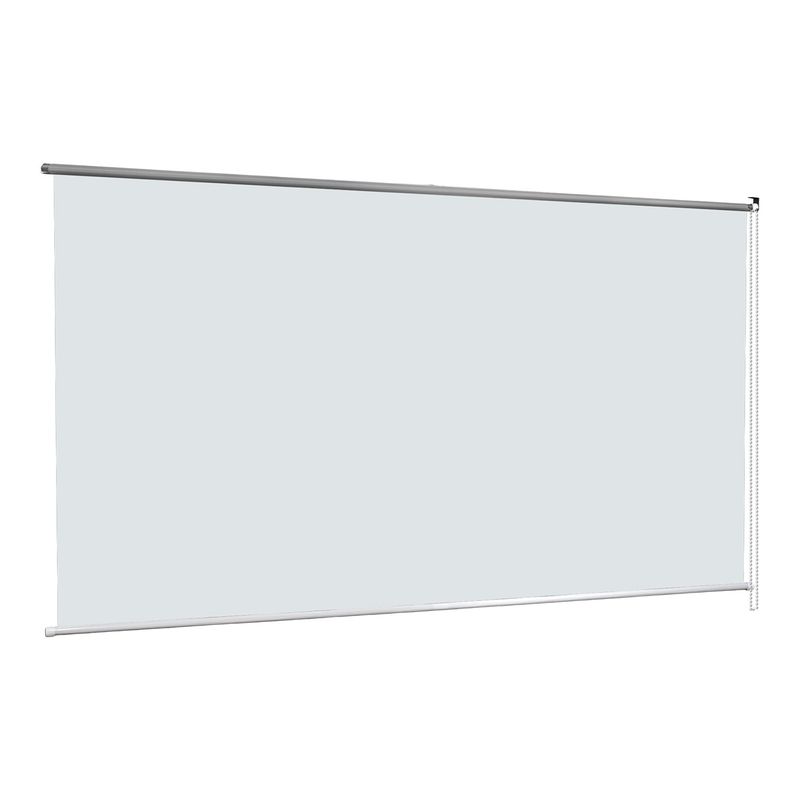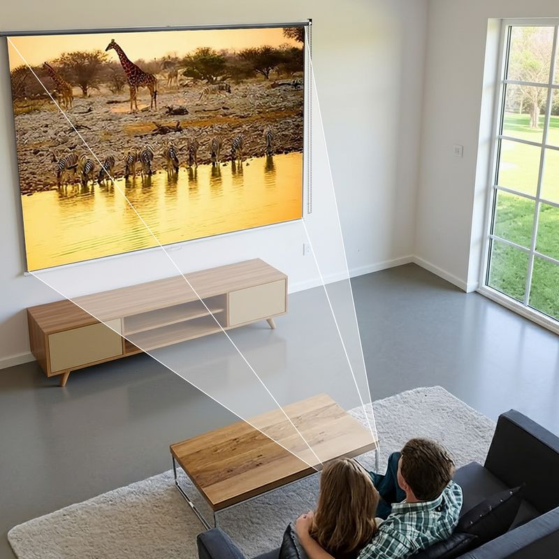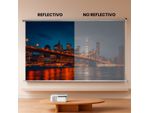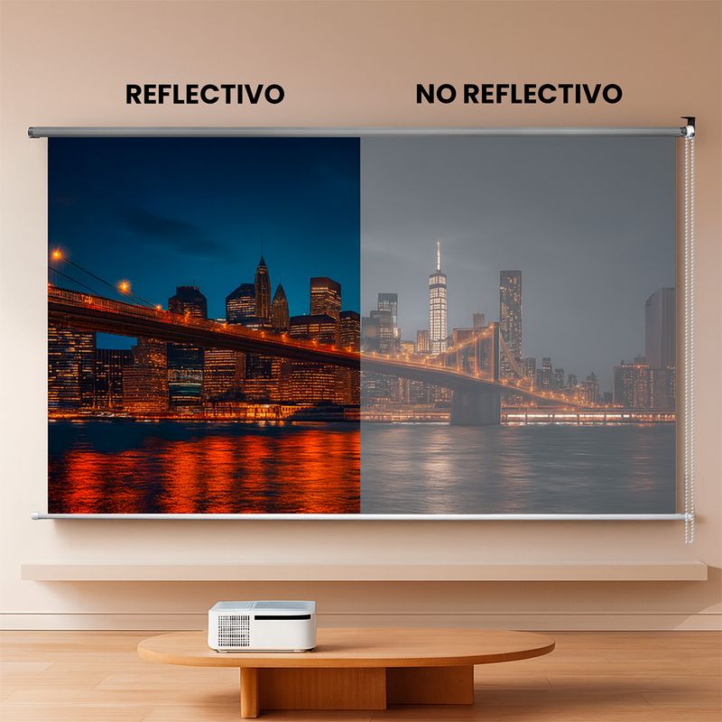 Pantalla blanca mate con bordes y respaldo negros que mejoran el contraste y la calidad de proyección. Ideal para oficinas, aulas y entretenimiento en casa, ajustable en altura para adaptarse a diferentes espacios. Su superficie ayuda a conservar la resolución y luminosidad del proyector.